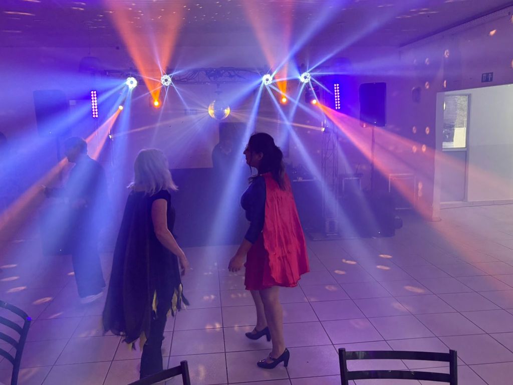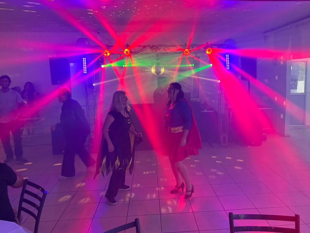 Strobo,1 globo espelhado, 2 canhões para iluminação do globo, 2 mesas